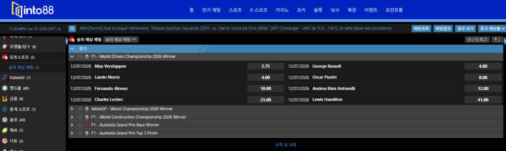 into88에서는 BTI, SBO, IBC 3대 메이저 스포츠북을 통해 F1 2026 시즌의 모든 배당을 비교하고,